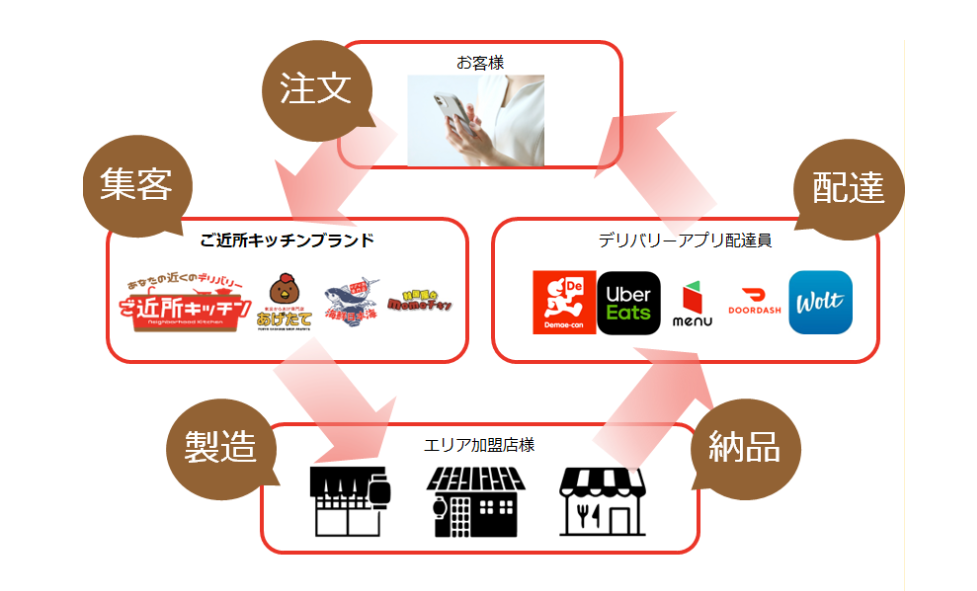 本サービスは、本部が全国のユーザーからのデリバリー注文を集め、ユーザー近くの飲食店がエリア販売店として商品メイクをする、集客(本部)製造(エリア販売店)配達(UberEats他)を分業制にした日本初のビジネスモデルです。飲食店は商品開発や集客に頭を悩ませることなくオーダーが自動的に入ってくる仕組みで、飲食店の店外売上として貢献します。