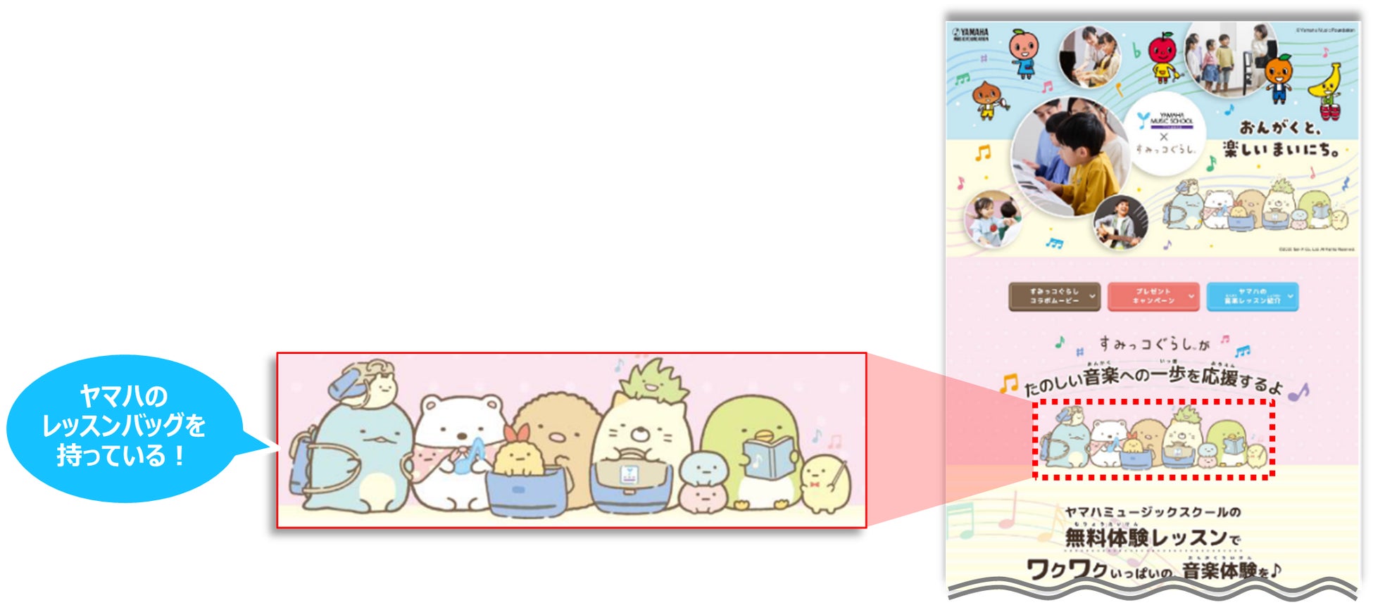 YAMAHA MUSIC SCHOOLにて実施する「すみっコぐらし」とのコラボキャンペーンでは、ヤマハのレッスンバッグをもっていたり、楽器が登場したりするなど音楽レッスン要素が盛り込まれたオリジナル描き下ろしのすみっコぐらしたちが、特設サイトやコラボ動画に登場します。
