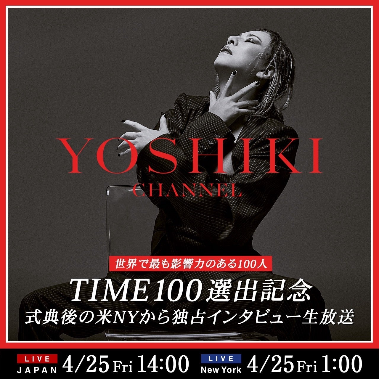 日本時間4月25日(金)14:00 (現地ニューヨーク4月25日1:00) から、ニコニコチャンネル(日本)およびYouTube Channelメンバーシップで配信されるYOSHIKI CHANNELにて、ニューヨークで行われる「TIME100」式典出席後のYOSHIKIと東京のスタジオを繋いで、独占インタビューを生放送することが決定した。