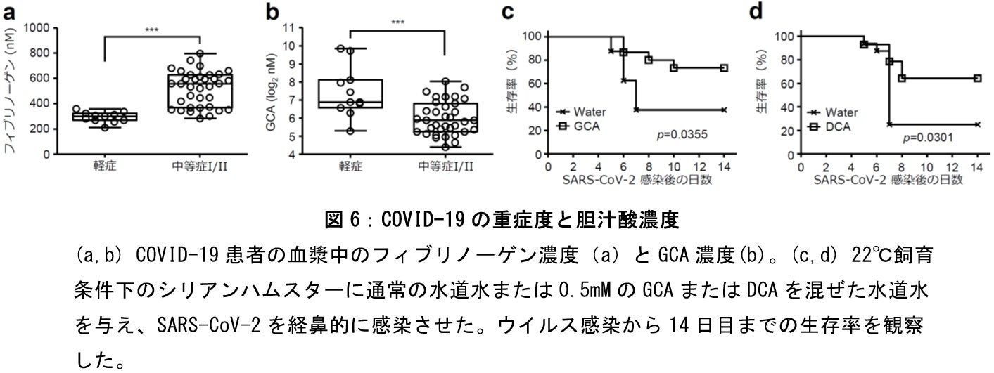 最後にCOVID-19患者の重症度と血漿中の胆汁酸レベルに相関があるかどうかを解析しました。COVID-19患者を軽症、中等症Ⅰ/Ⅱのグループに分けると、確かに血漿中の重症化マーカーであるフィブリノーゲン(注4)が中等症Ⅰ/Ⅱグループで有意に高くなっていることが分かり(図6a)、逆に胆汁酸の一種であるグリシン抱合型コール酸(GCA)が中等症Ⅰ/Ⅱグループで有意に低くなっていることが明らかとなりました(図6b)。このことはヒトにおいてもCOVID-19の重症度と胆汁酸レベルに逆相関関係があることを示しています。そこで22℃飼育条件下のハムスターに通常の水道水またはGCAまたはDCAを混ぜた水道水を与え、SARS-CoV-2を経鼻的に感染させるとGCAやDCAを与えたグループでは、SARS-CoV-2感染後の生存率が有意に改善することが分かりました(図6c,d)