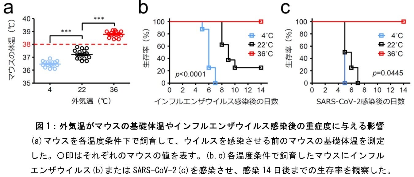 これまで外気温や体温がウイルス感染後の重症度に与える影響について詳細に解析された例はありませんでした。東京では夏に気温が36℃に達することもある一方、1月の平均最低気温は約4℃まで低下します。またインフルエンザや新型コロナウイルス感染症(COVID-19)の死亡率は、高齢者で高くなることが知られています。高齢者は筋力の低下などが原因で基礎体温が低下することから、研究グループは外気温や体温に着目し、それらがインフルエンザウイルスやSARS-CoV-2に対する抵抗力に与える影響について解析しました。