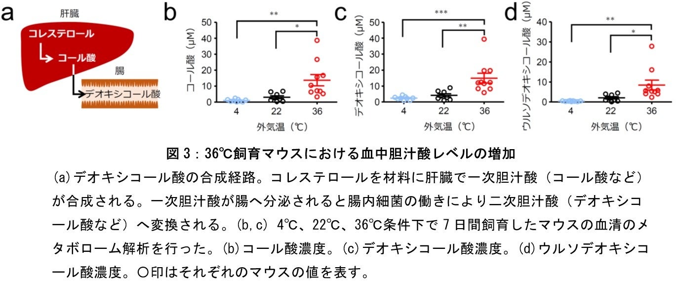次にウイルス感染に対する抵抗力が高くなる36℃飼育マウスの体内で何が起こっているのかを解析するため、4℃、22℃、36℃で7日間飼育したマウスの血清サンプルを用いてメタボローム解析を行いました。すると一次胆汁酸(注1)であるコール酸や二次胆汁酸であるデオキシコール酸、ウルソデオキシコール酸の濃度が36℃飼育マウスの血中で有意に高くなっていることが分かりました(図3)。