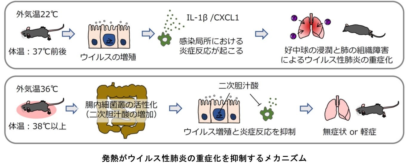 体温の上昇により活性化した腸内細菌叢は、体内の二次胆汁酸レベルを増加させて、ウイルスの増殖およびウイルス感染による炎症反応を抑えていることが分かった。