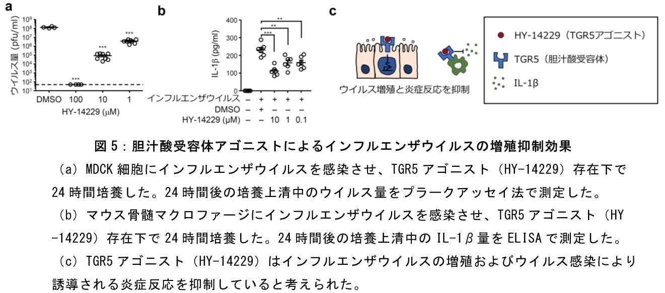 次に胆汁酸受容体であるTGR5のアゴニストであるHY-14229がインフルエンザウイルスの増殖や炎症反応を抑制する効果を示すのかを調べるため、培養細胞やマクロファージにインフルエンザウイルスを感染させ、HY-14229存在下で24時間培養しました。するとHY-14229存在下では、インフルエンザウイルスの増殖やウイルス感染により誘導されるIL-1β(注3)の産生が抑えられていることが分かりました(図5)。