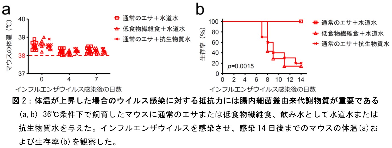 36℃条件下で飼育したマウスの体温が38℃を越えるようになるとウイルス感染に対する抵抗力が高くなる理由として、発熱により温められた体内の腸内細菌叢が活性化しているのではないかと考えました。この仮説を検証するため、通常のエサと水道水を与えたコントロールグループ、低食物繊維食と水道水を与えた低食物繊維食グループ、通常のエサと抗生物質を混ぜた水道水を与えた抗生物質グループに分け、このマウスを36℃条件下で飼育したあと、インフルエンザウイルスを経鼻的に感染させました。するとどのグループもウイルス感染前後の体温は38℃以上に保たれていたものの(図2a)、低食物繊維食グループや抗生物質グループはインフルエンザウイルス感染に対する抵抗力が失われていることが分かりました(図2b)。このことから、インフルエンザウイルス感染に対する抵抗力の獲得には38℃以上の体温そのものではなく、発熱により温められた際の腸内細菌叢の活性化が重要であることが示唆されました。