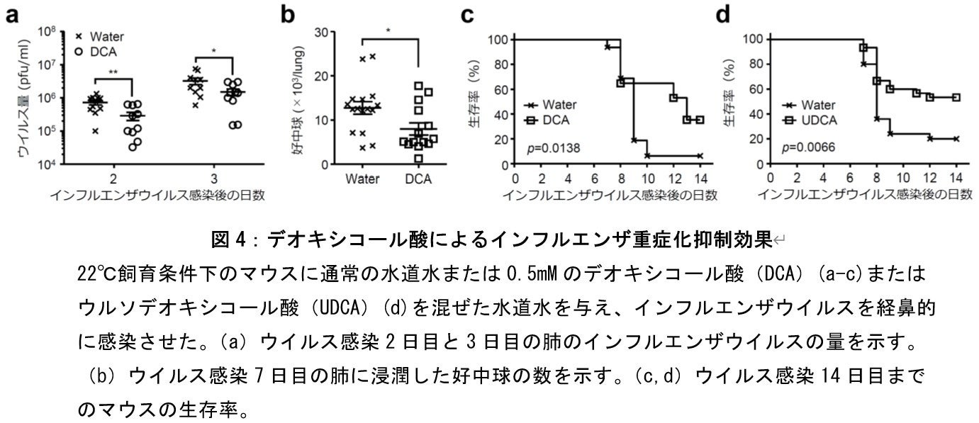 次に22℃飼育条件下のマウスに通常の水道水またはデオキシコール酸(DCA)やウルソデオキシコール酸(UDCA)を混ぜた水道水を与え、インフルエンザウイルスを経鼻的に感染させました。するとDCAやUDCAを与えたグループでは、肺のウイルス量や好中球(注2)の数が減少し(図4a,b)、インフルエンザウイルス感染後の生存率が有意に改善することが分かりました(図4c,d)。