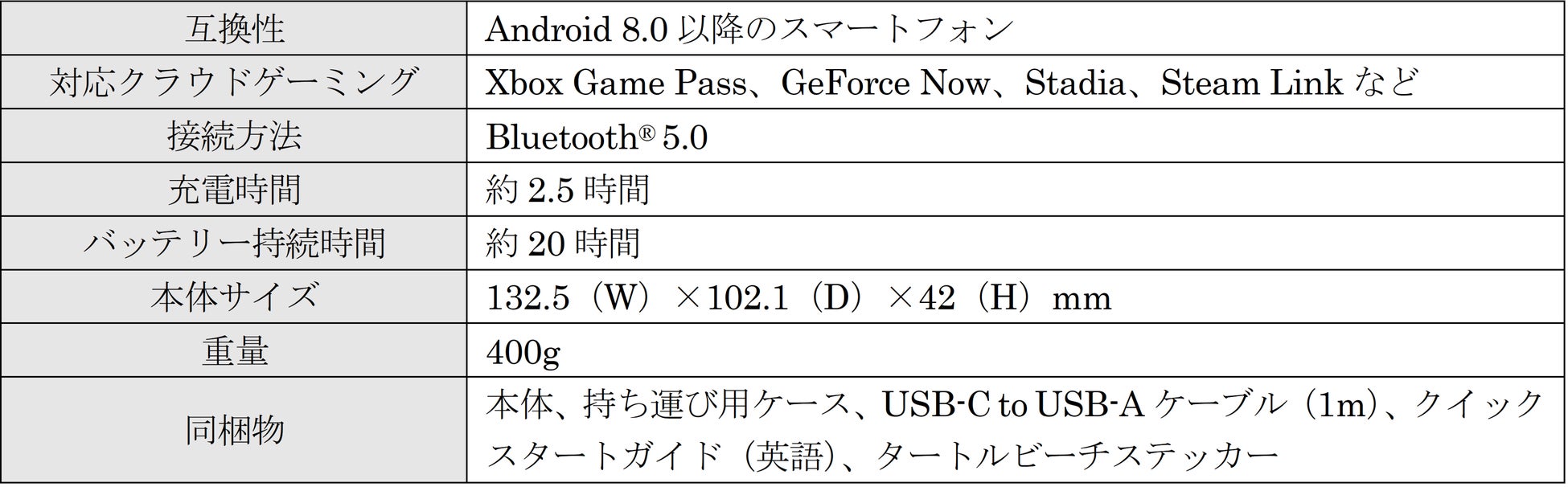 「Atom モバイルゲームコントローラー」は、Androidデバイスでのクラウドゲーミングに対応したモバイルゲームコントローラーです。Android 8.0以降のスマホとBluetooth®接続することで、没入感あふれるクラウドゲーミング体験を提供します。コントローラーは2つの独立したモジュールで構成され、ゲームプレイ時には、モジュール同士を2.4GHzワイヤレスで接続します。コントローラーとAndroidデバイスは、低遅延のBluetooth®接続のため、Xbox Game PassやGeForce Now、Stadia、Steam Linkなどのクラウドゲームで、ラグのない安定したプレイを可能にします。また、調整可能なバネ式のスマートフォンクランプを採用しており、あらゆるサイズのAndroidスマホにフィット。人間工学に基づいた持ち手の形状により、コンソールスタイルの操作ができ、リラックスしながら快適なゲームプレイを長時間楽しめます。バッテリーは約20時間持続し、充電時はわずか2.5時間ほどで100%の充電が可能です。収納時には、各モジュールに内蔵のマグネットで一体化させることができるため、ポケットや付属の携帯用ポーチに入れ、コンパクトな状態で持ち運びができます。この他、Play StoreでAtomコンパニオンアプリをダウンロードすれば、追加機能の設定や新しいゲームの検索、ファームウエアの更新も行えます。