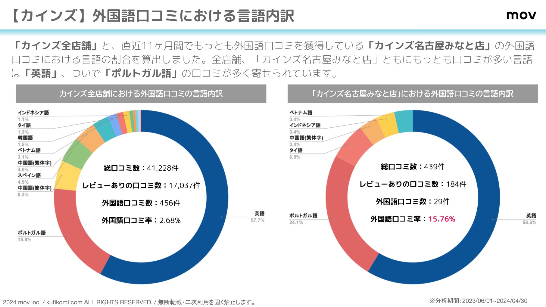 全店舗、「カインズ名古屋みなと店」ともにもっとも口コミが多い言語は「英語」、ついで「ポルトガル語」の口コミが多く寄せられています。