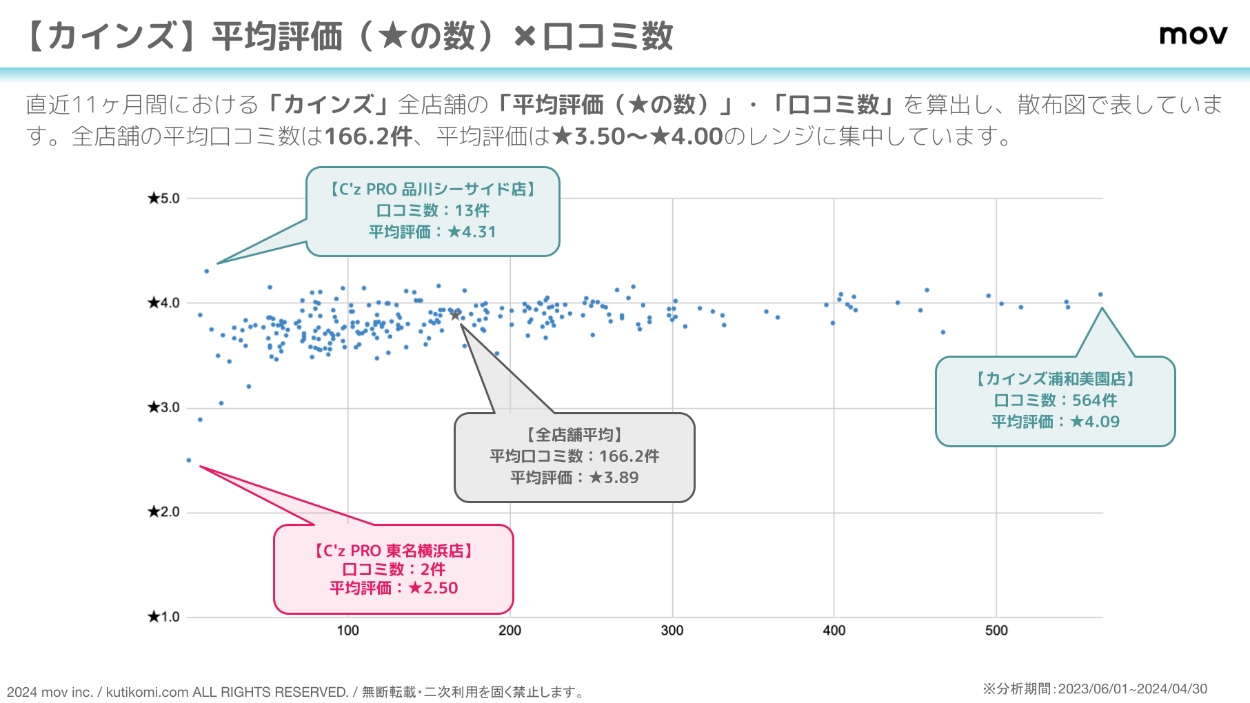 直近11ヶ月間における「カインズ」全店舗の「平均評価(★の数)」・「口コミ数」を算出し、散布図で表しています。全店舗の平均口コミ数は166.2件、平均評価は★3.50〜★4.00のレンジに集中しています。