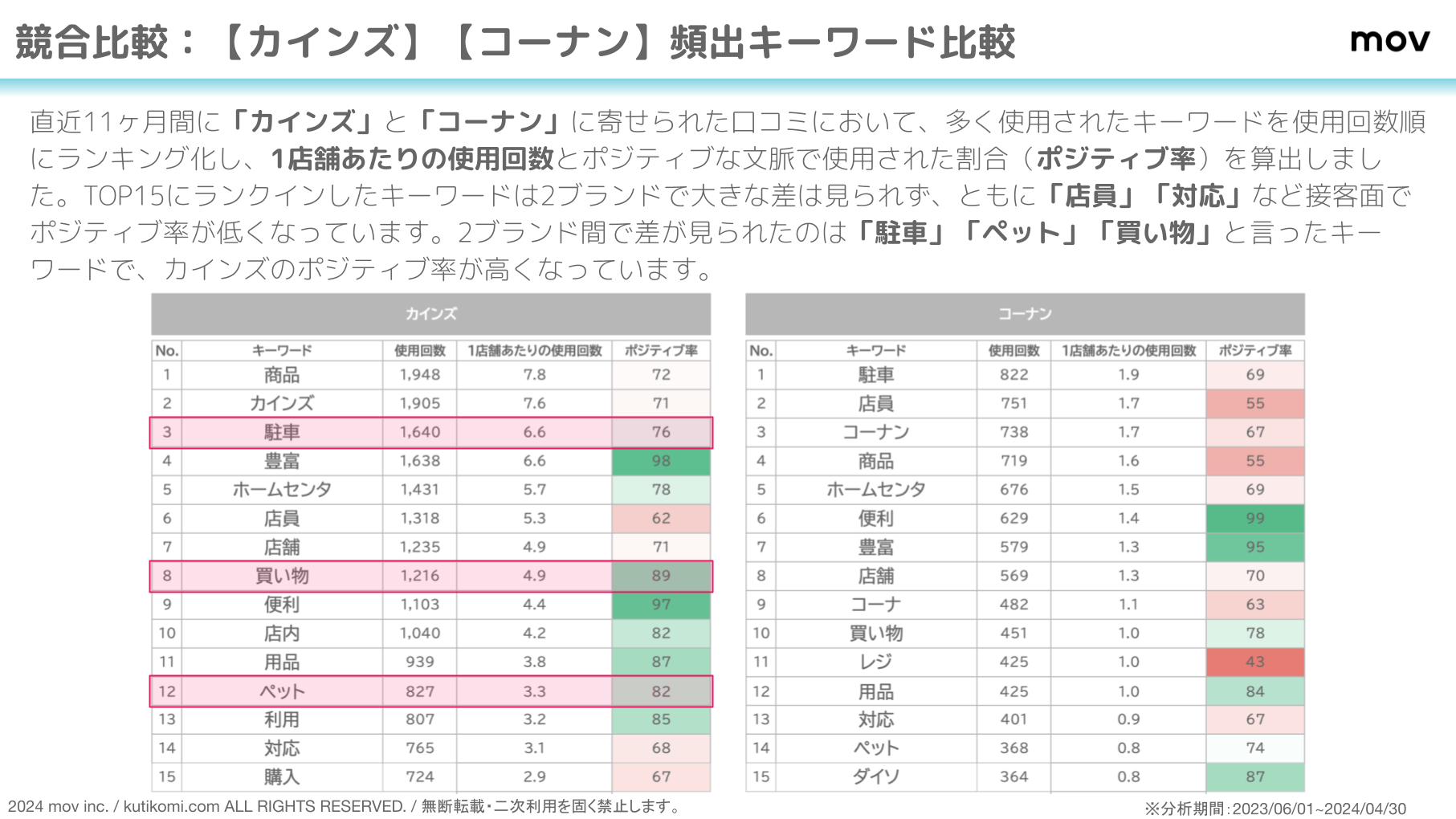 TOP15にランクインしたキーワードは2ブランドで大きな差は見られず、ともに「店員」「対応」など接客面でポジティブ率が低くなっています。2ブランド間で差が見られたのは「駐車」「ペット」「買い物」と言ったキーワードで、カインズのポジティブ率が高くなっています。