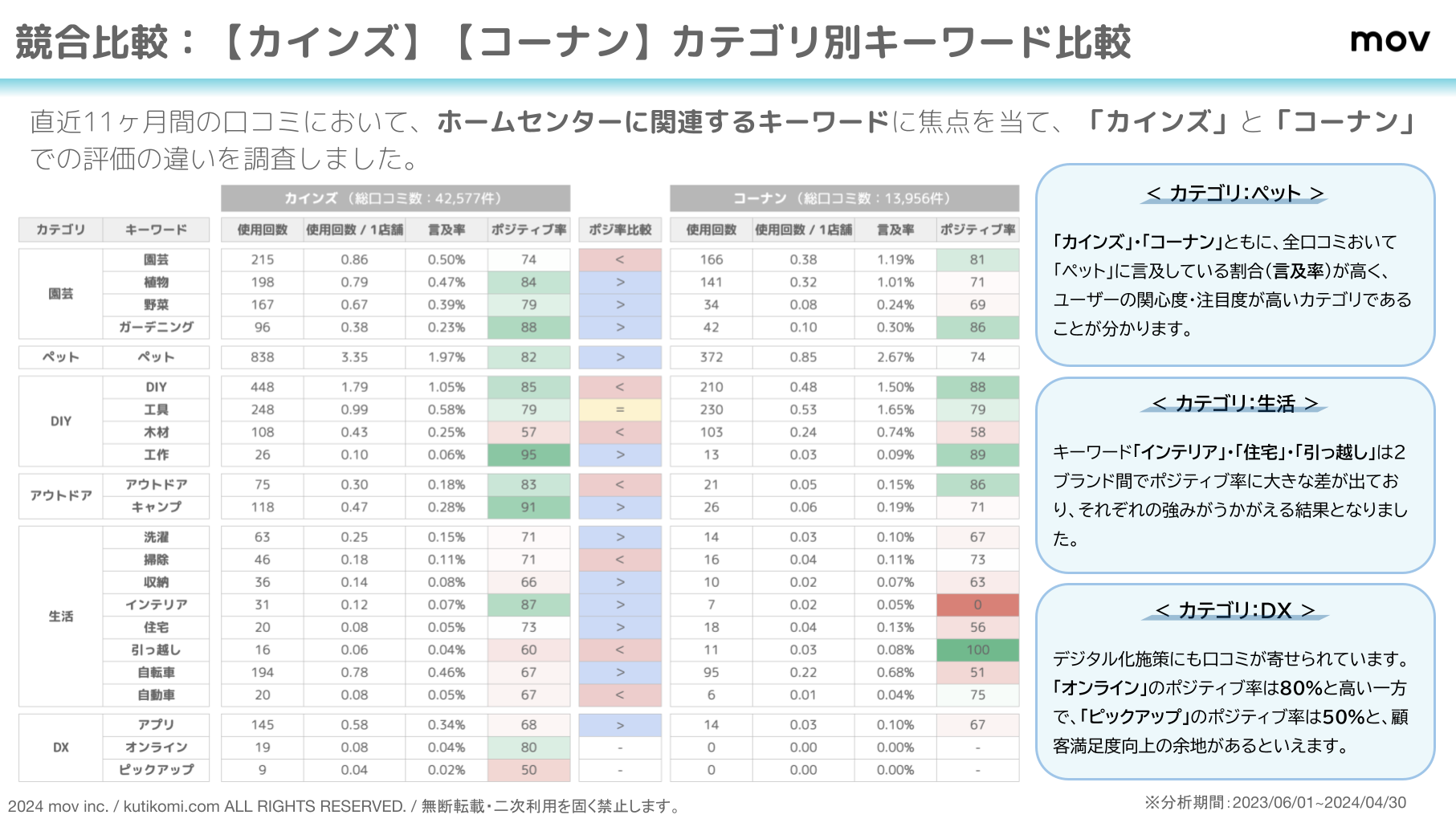 直近11ヶ月間の口コミにおいて、ホームセンターに関連するキーワードに焦点を当て、「カインズ」と「コーナン」での評価の違いを調査しました。