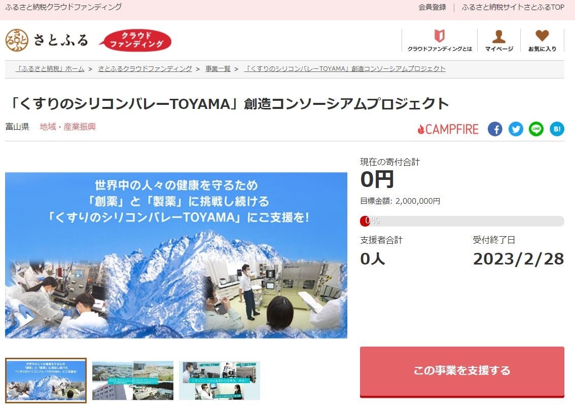 富山県とふるさと納税ポータルサイト「さとふる」(https://www.satofull.jp/)を運営する株式会社さとふる(本社:東京都中央区、代表取締役社長:藤井 宏明)は、寄付金の使途に応じて事業を立ち上げ寄付を募る「さとふるクラウドファンディング」(https://www.satofull.jp/projects/top.php)にて、県の中核産業である医薬品産業の研究開発支援や人材育成のため、2022年12月1日(木)より寄付受け付けを開始します。