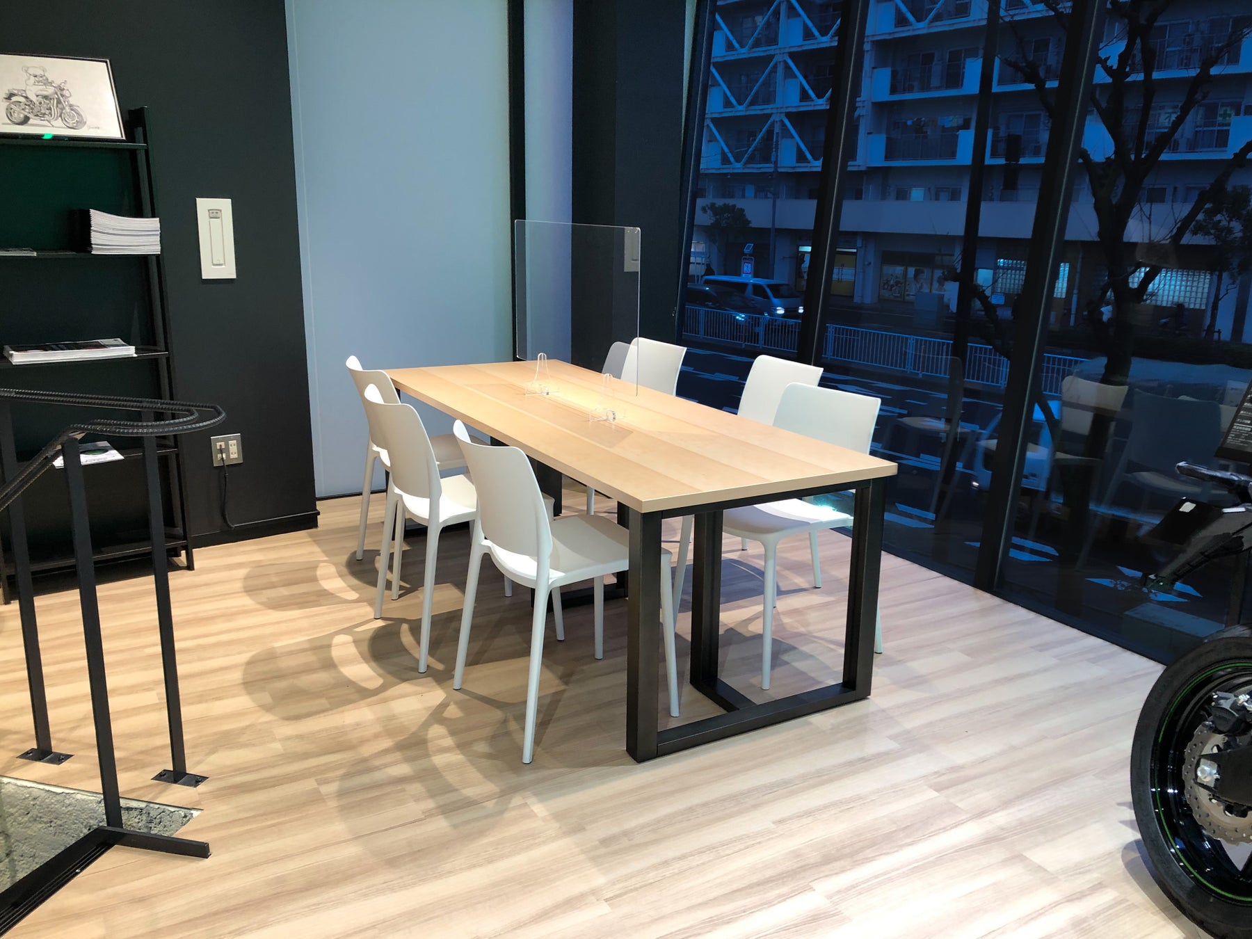 木目のフロアがあたたかな雰囲気を醸し出す、「カワサキ プラザ東京足立」。経験豊かなコンシェルジュとテクニシャンが、装いも新しくなった店舗で皆様のモーターサイクルライフをお手伝いいたします。