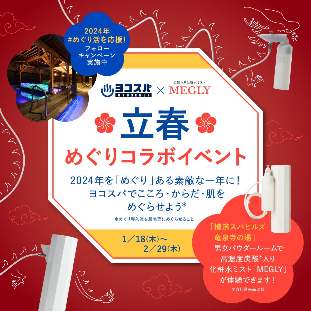 株式会社MTG(本社:愛知県名古屋市、代表取締役社長:松下剛)の炭酸セルフケアブランド「MEGLY(メグリー)」は、オークランド観光開発株式会社(所在地:愛知県春日井市、代表取締役:松永 明子)が運営する関東最大級の温浴施設「横濱スパヒルズ 竜泉寺の湯」と2024年1月18日(木)~2月29日(木)の期間限定で『立春めぐりコラボイベント』を開催いたします。