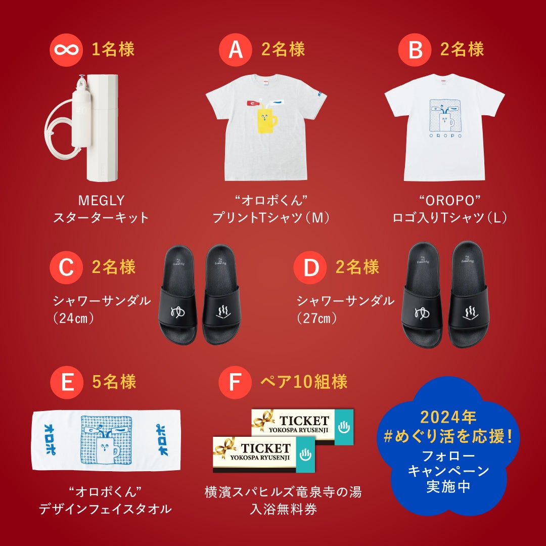 コラボイベント期間中は、男女パウダールームへの高濃度炭酸*¹入り化粧水ミスト「MEGLY」の設置のほか、立春めぐりコラボ特典付き*²商品の販売、合計24名様に豪華「めぐりグッズ」が当たるフォローキャンペーンを実施いたします。ぜひこの機会に「横濱スパヒルズ 竜泉寺の湯」で2024年の“初めぐり”をご体験ください!