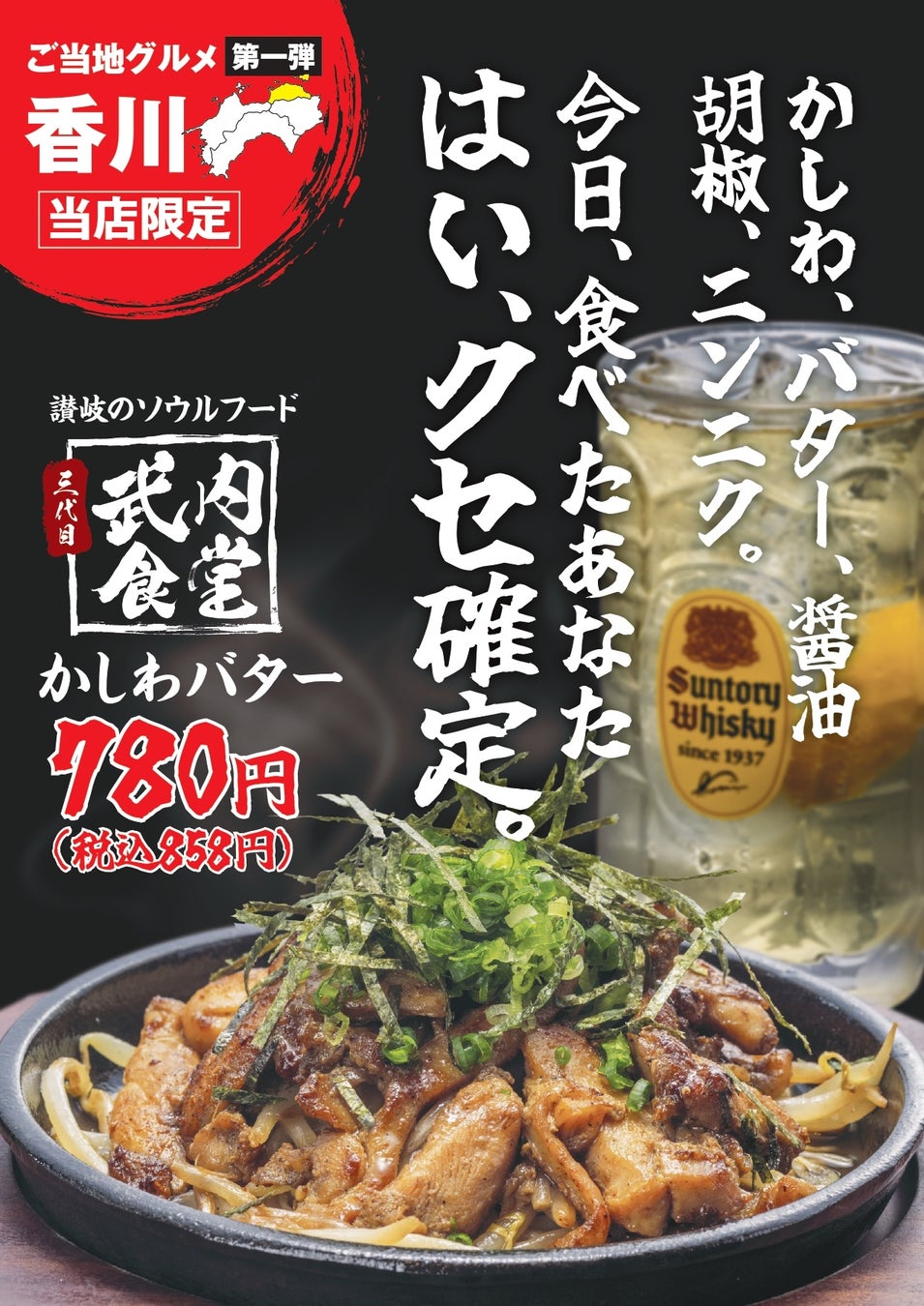 そしてこのたび、香川の味をもっと多くの方に楽しんでいただくために、『かしわバター』 が、全国の銀だこハイボール酒場業態一部店舗限定で登場いたします!