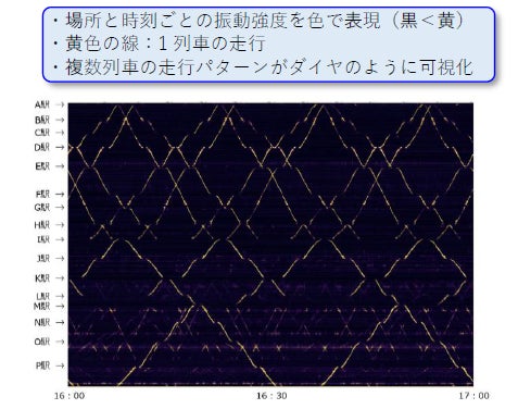 取得したデータの解析により、列車の走行位置を高精度に検知できることが確認され(図2)、光ファイバセンシング技術の有効性を示す重要な知見が得られました。