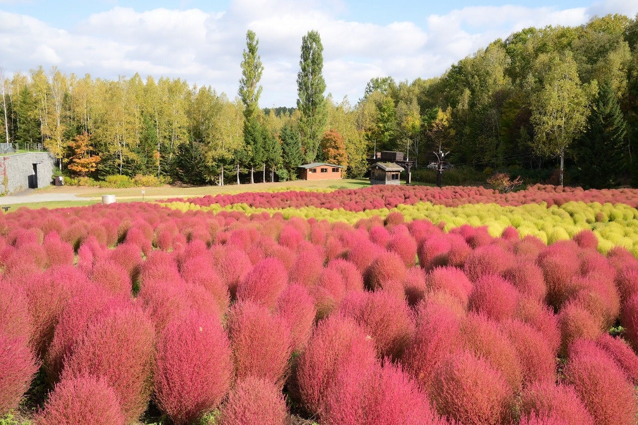 国営滝野すずらん丘陵公園(札幌市南区滝野247)では、紅葉の時期に合わせて【たきの紅葉まつり】を開催しています。10/14現在、もこもこのコキアが赤く染まり、紅葉の見頃を迎えています。