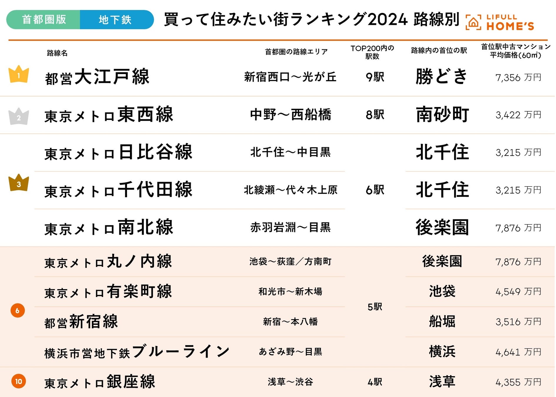 首都圏における「買って住みたい街ランキング」TOP200内の駅と路線を対象に地下鉄路線別に集計した「買って住みたい街が多い鉄道路線ランキング首都圏地下鉄編」では9駅がランクインした都営大江戸線が1位となりました。2位は東京メトロ東西線(TOP200内ランクイン数:8駅)、3位は東京メトロ日比谷線、千代田線、南北線(同6駅)で同率です。6位は東京メトロ丸ノ内線、有楽町線、都営新宿線、横浜市営地下鉄ブルーラインが同率(同5駅)、10位は東京メトロ銀座線(同4駅)という結果でした。