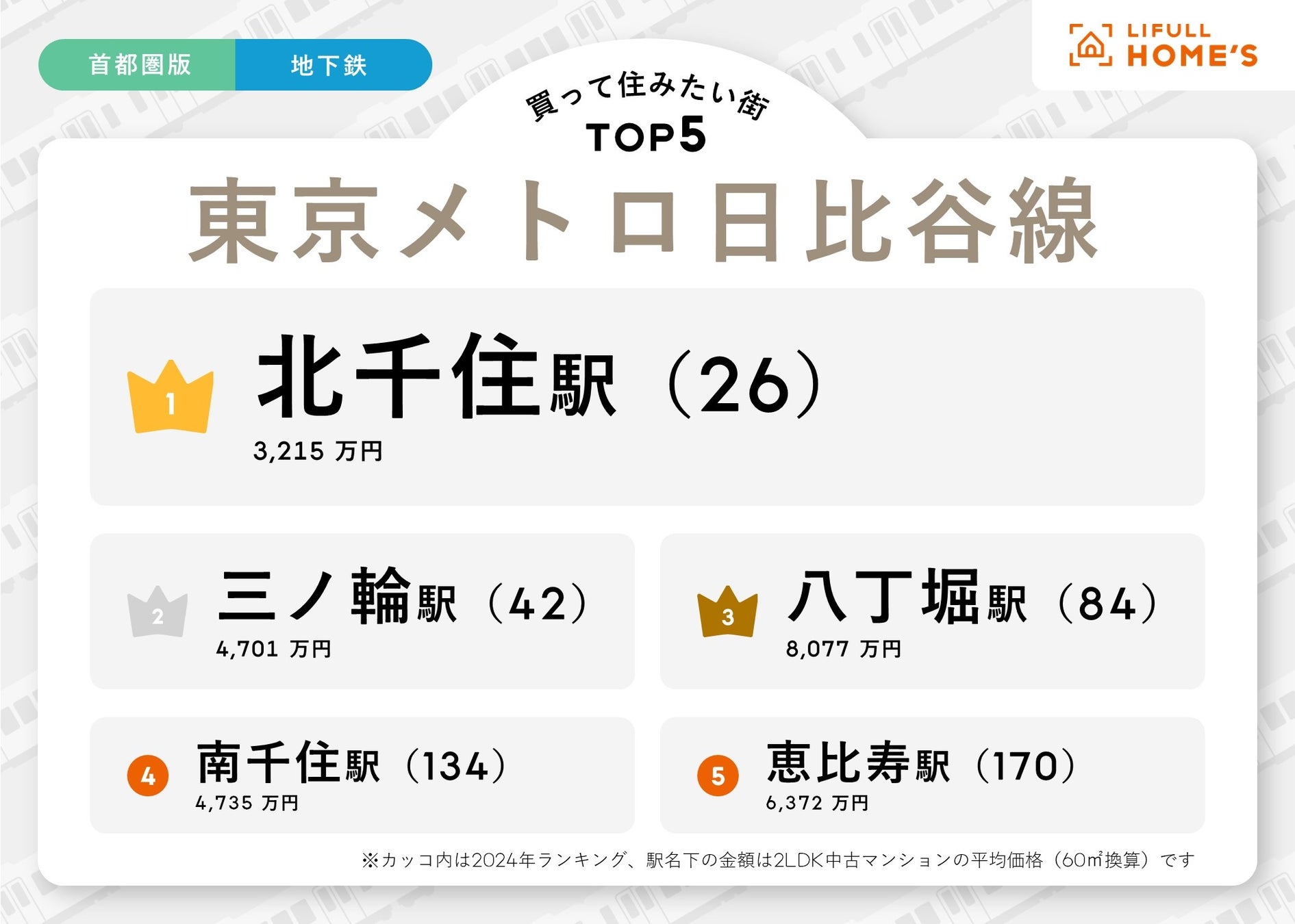 「買って住みたい街が多い鉄道路線ランキング首都圏地下鉄編」の同率3位は東京メトロ日比谷線です。