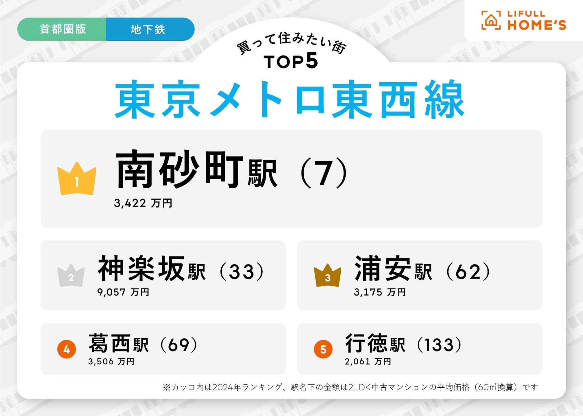 東京メトロ東西線の住みたい街ランキング1位は「南砂町」(買って住みたい街ランキング首都圏版7位)、2位「神楽坂」(同33位)、3位「浦安」(同62位)、4位「葛西」(同69位)、5位「行徳」(同133位)となりました。東京メトロ東西線は、東京都中野区の「中野」から千葉県船橋市の「西船橋」までを結び、「大手町」「日本橋」など都心へのアクセスから多くの通勤や通学客に利用されています。利便性の高さに加え、江戸風情の残る街や外国人にも人気の高い街から学生街まで、街ごとにがらりと表情が変わる個性豊かな路線です。