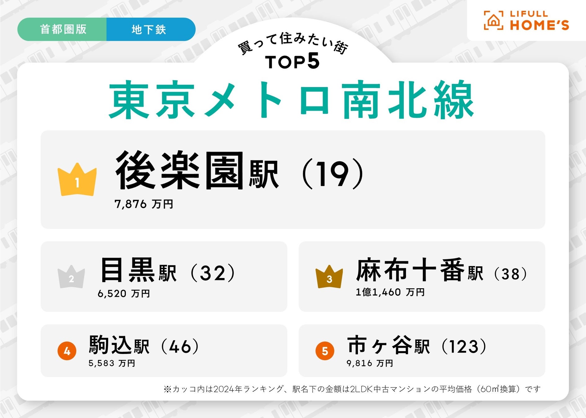 この東京メトロ南北線の住みたい街ランキングは1位「後楽園」(買って住みたい街ランキング首都圏版19位)、2位「目黒」(同32位)、3位「麻布十番」(同38位)、4位「駒込」(同46位)、5位「市ヶ谷」(同123位)となりました。東京メトロ南北線は、東京都品川区の「目黒」から北区の「赤羽岩淵」までを結び、1991年平成3年に入って開業された路線です。