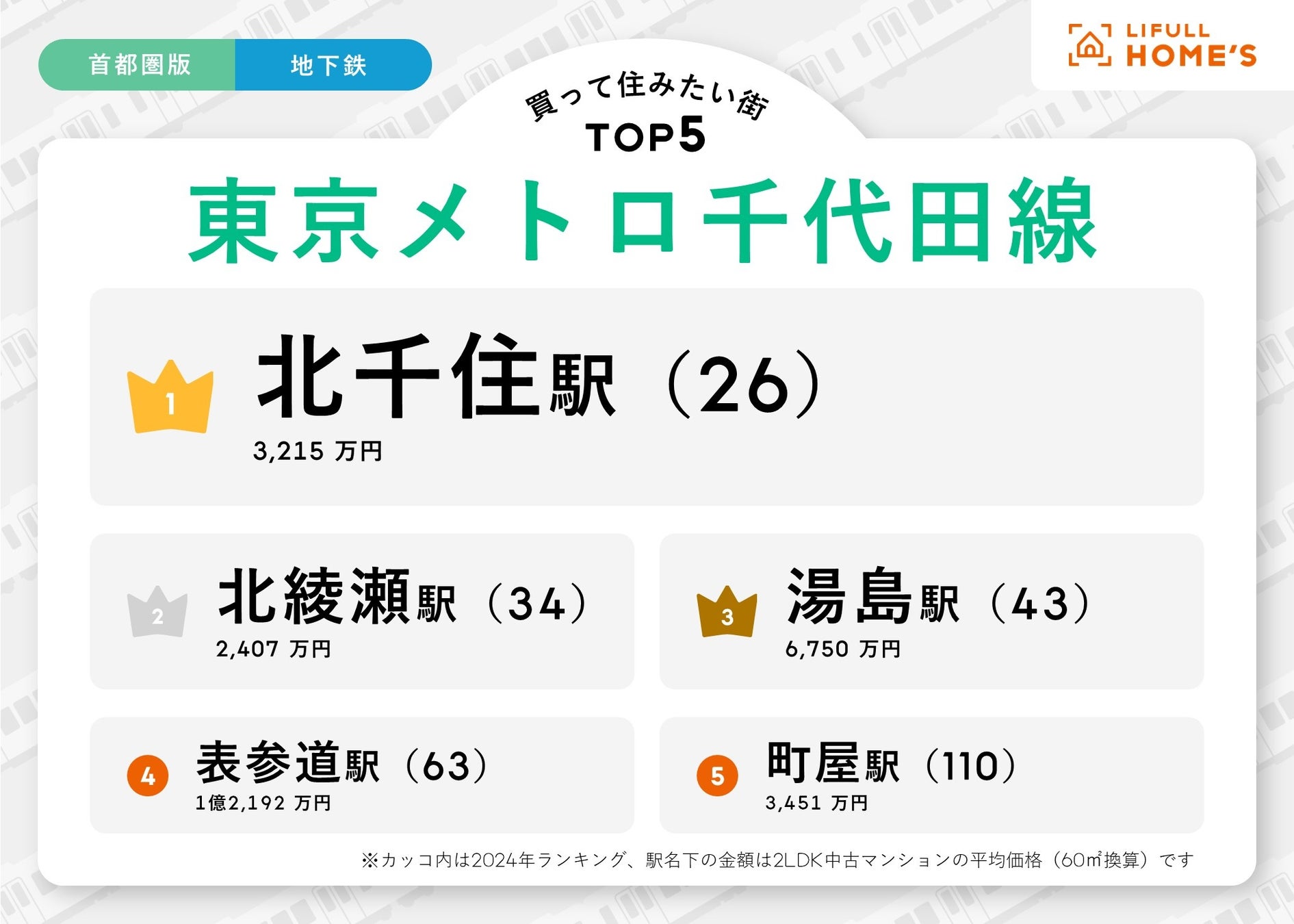 この東京メトロ千代田線における住みたい街ランキングは1位「北千住」(買って住みたい街ランキング首都圏版26位)、2位「北綾瀬」(同34位)、3位「湯島」(同43位)、4位「表参道」(同63位)、5位「町屋」(同110位)となりました。東京メトロ千代田線は、東京都足立区の「綾瀬」から渋谷区の「代々木上原」まで、「綾瀬」から足立区の「北綾瀬」までの区間で構成されています。