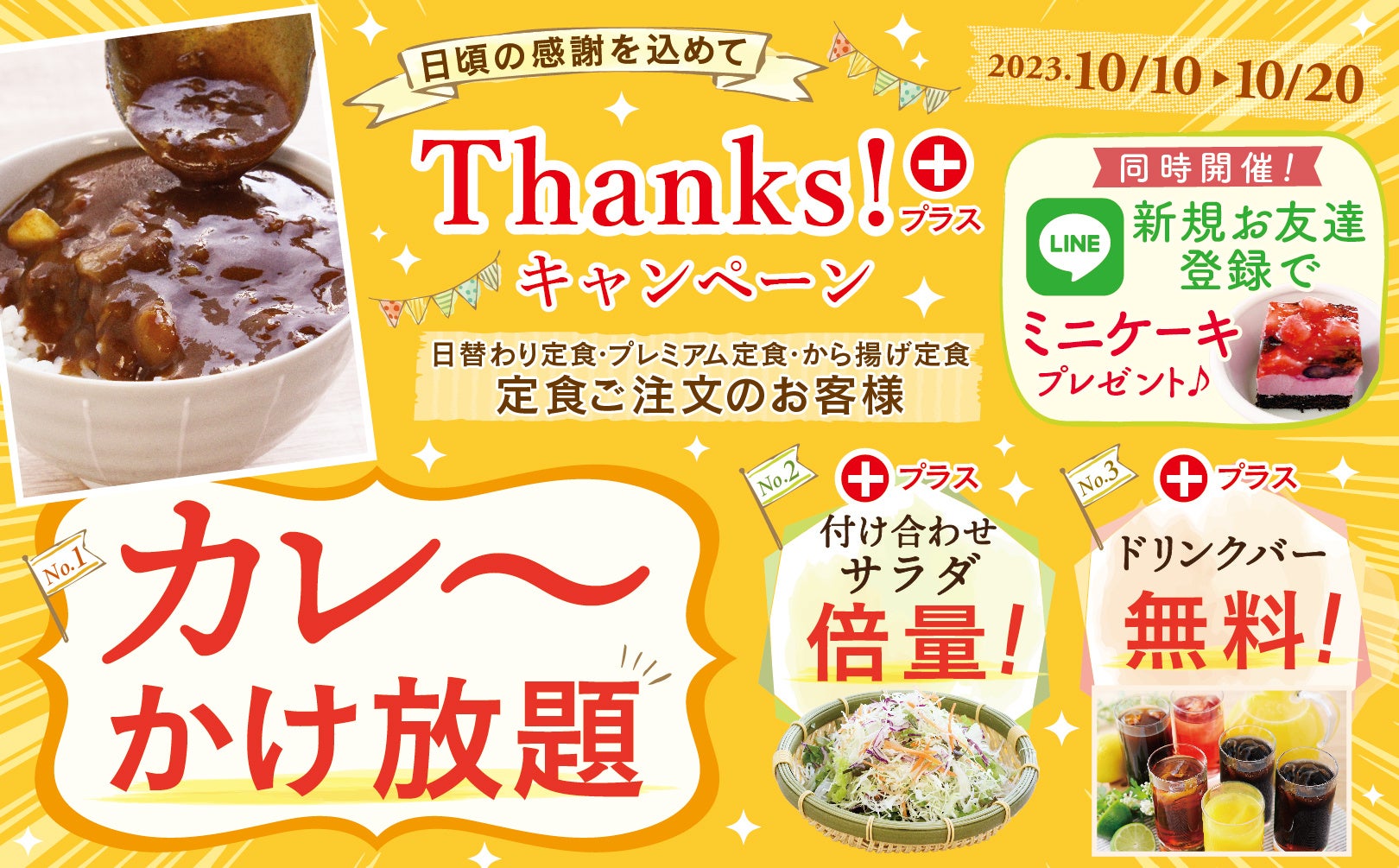この度、日替わり定食・プレミアム日替わり定食・から揚げ定食をご注文のお客様限定!『プラス』な特典をご提供する『サンクスプラスキャンペーン』を開催いたします!