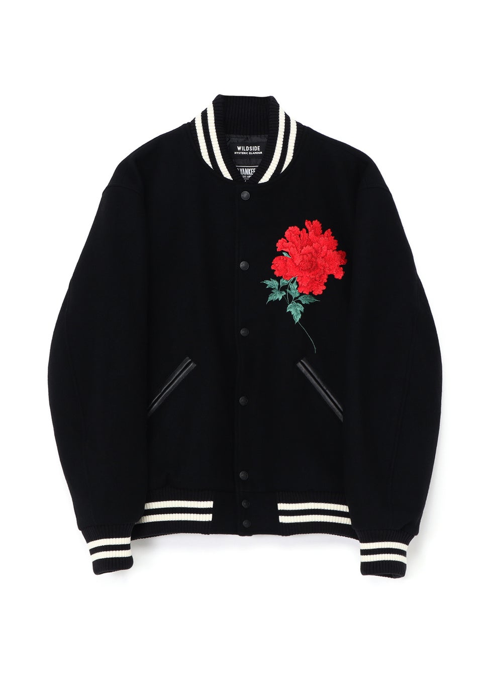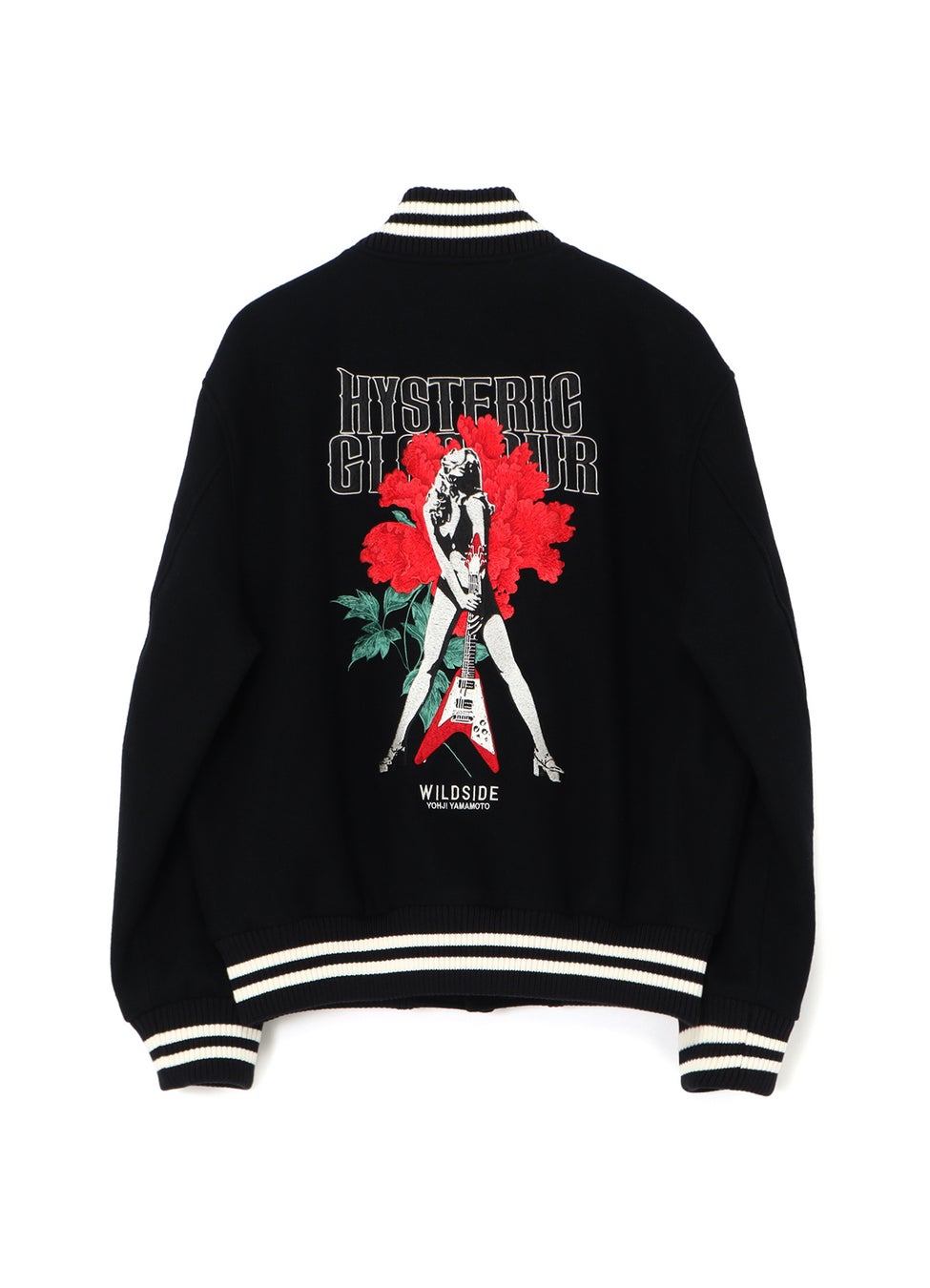 メルトンの素材感を残しつつ、アクリル樹脂加工を施し、風合いをより堅くヴィンテージ感のある仕上がりにした本コラボレーションのメインアイテムであるスタジャン。グラフィックには、赤い“FLYING V”を携えるHYSTERIC WOMANと、赤い牡丹を掛け合わせ魅惑的なヘヴィメタルのインパクトのあるデザインを刺繍で表現しています。