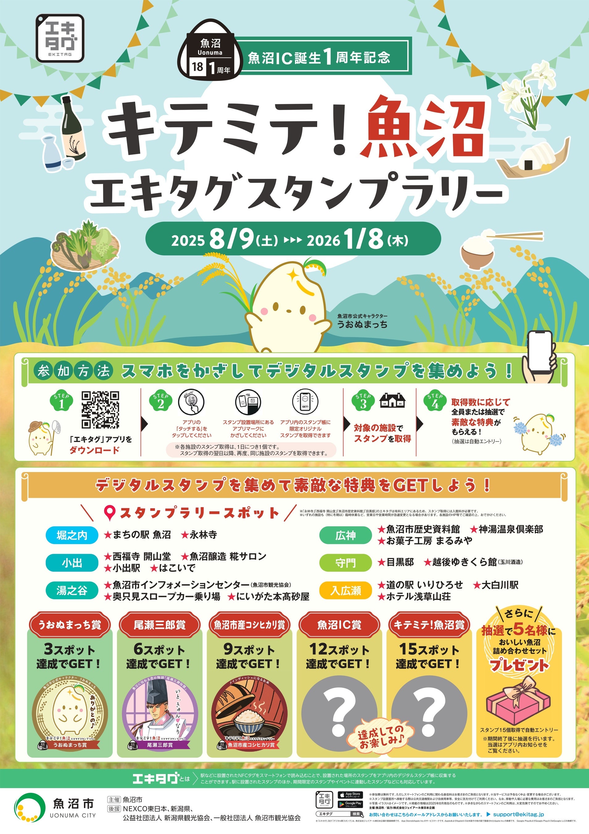 ◎株式会社ジェイアール東日本企画が提供する駅スタンプアプリ「エキタグ」では、2025年8月9日(土)より魚沼IC誕生1周年を記念した「キテミテ!魚沼 エキタグスタンプラリー」が開催されます。