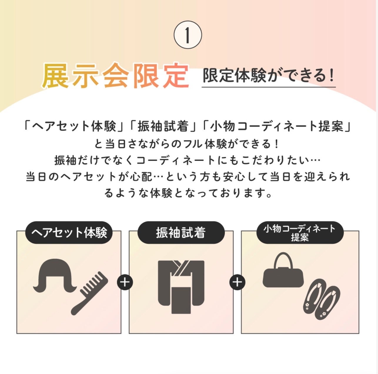 今回の展示会では「ヘアセット」×「振袖試着」×「小物コーディネート」の限定体験を実施。