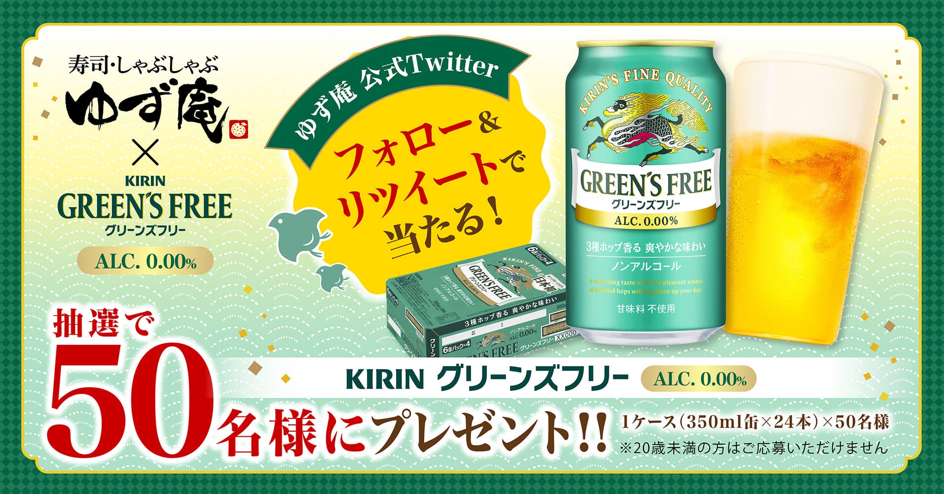 株式会社物語コーポレーション(本社:愛知県豊橋市/代表取締役社長:加藤 央之)が全国94店舗展開する『寿司・しゃぶしゃぶ ゆず庵』(以下、ゆず庵)は、お客様の日頃のご愛顧に感謝を込めて、キリンビール株式会社のノンアルコール・ビールテイスト飲料「キリン グリーンズフリー」を50名様にプレゼントするキャンペーンを開催いたします。