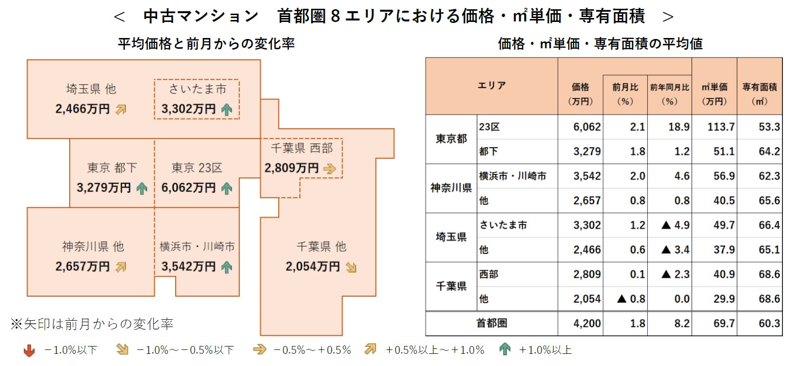 ●首都圏の中古マンション1戸あたり平均価格は4,200万円で、前月比は+1.8%、前年同月比は+8.2%といずれも5カ月連続で上昇。