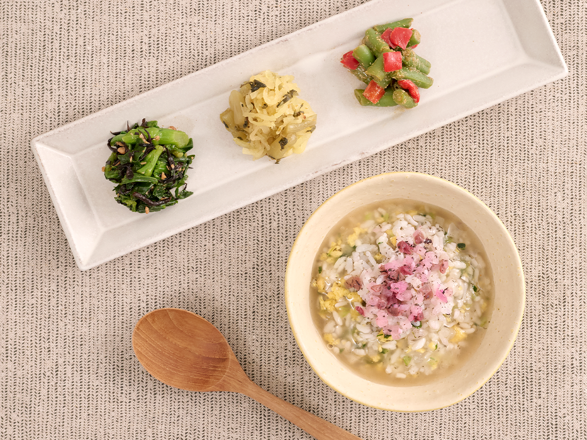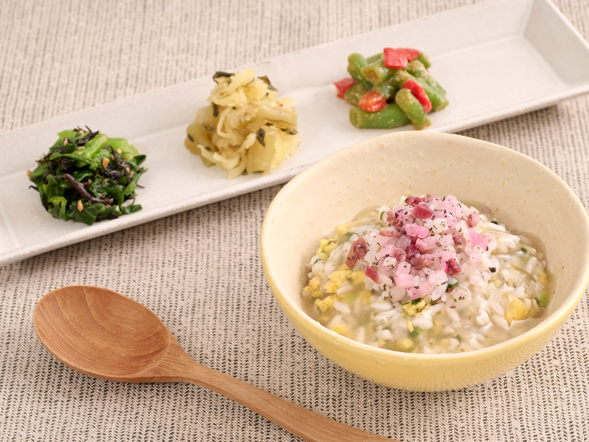三島食品の「ゆかり®」使用!彩り豊かで爽やかな酸味が魅力のおかゆが登場です!小松菜、卵を加えてまろやかでやさしい味わいに仕上げており、大根を加えることでシャキシャキとした食感も楽しんでいただけます。1日のスタートにはもちろん、小腹が空いた時、夜食にもピッタリな逸品です。