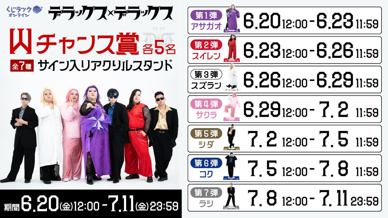 カルチュア・エンタテインメント株式会社は、2025年6月20日(金)よりロックバンド『デラックス×デラックス』オンラインくじを、「くじラックオンライン」で販売いたします。