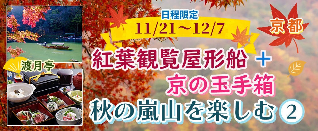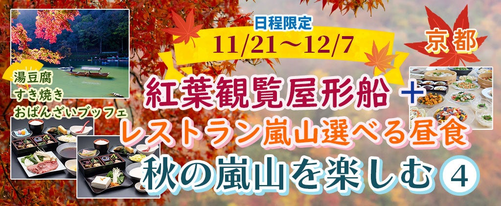11月21日・12月1日催行確定に付き10席増席 お一人様5,300円-から【11/21~12/7日程限定出発】【京都・嵐山】秋の嵐山を楽しむ 紅葉観覧屋形船+嵐山で昼食