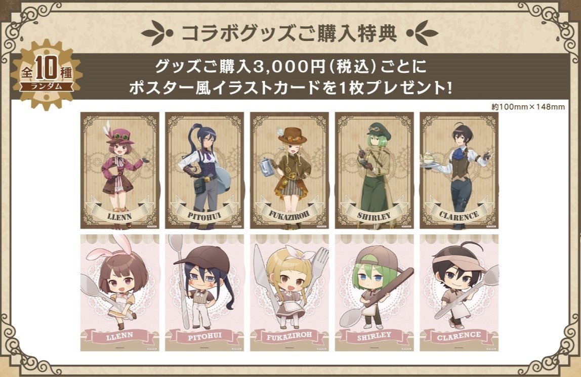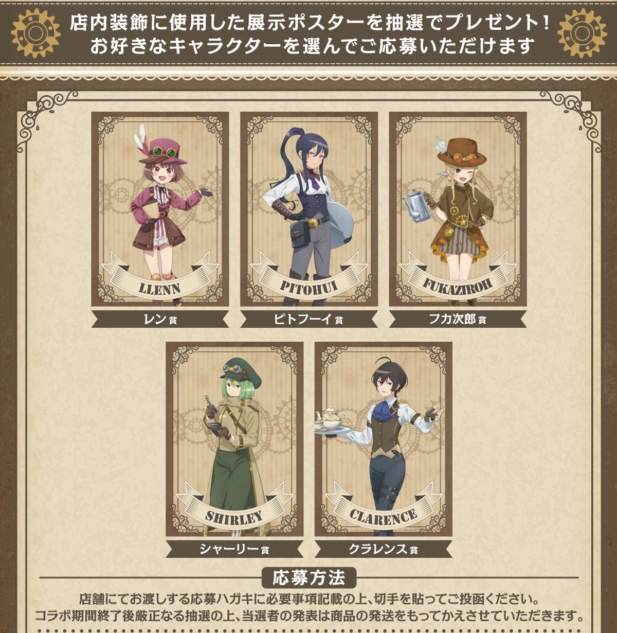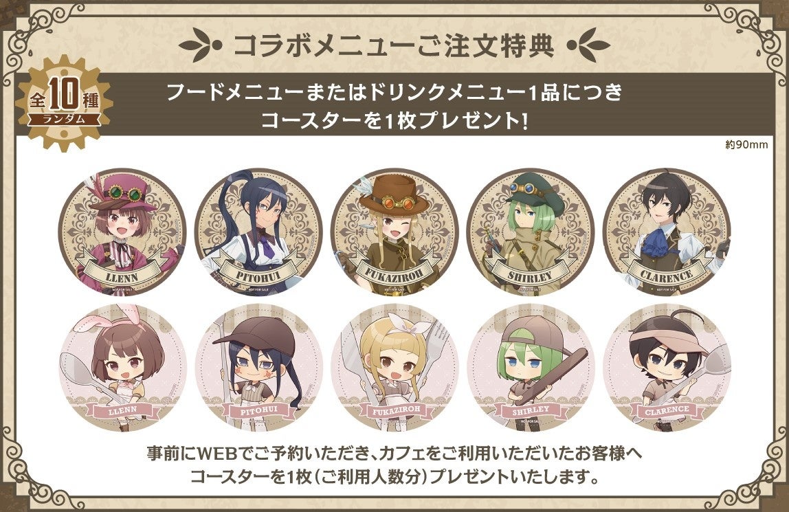 また、スチームパンク風の衣装を着たレンたち5人の描き下ろしイラストを使用した「アクリルフィギュアスタンド」やコラボカフェならではの「予約席風デスクプレート」など新作オリジナルグッズが多数登場いたします。
