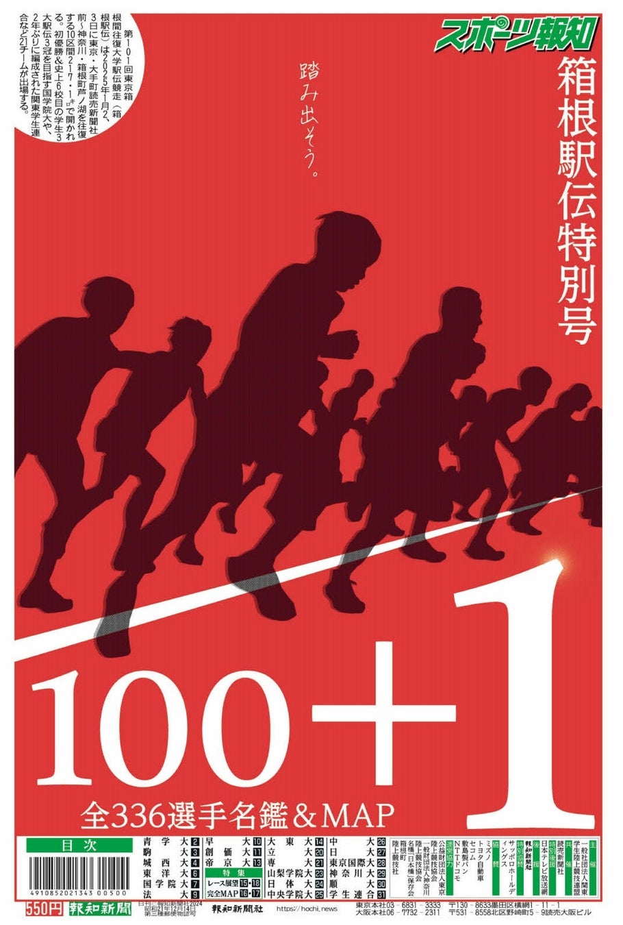 スポーツ報知を発行する報知新聞社(代表取締役社長・依田裕彦)は12月23日(月)からタブロイド新聞「2025箱根駅伝展望特別号」を発売します。2025年1月2、3日に開催される「第101回東京箱根間往復大学駅伝競走(箱根駅伝)」の見どころを特集したタブロイド特別号。出場全21チームを徹底取材し紹介しています。定価は550円(税込)。読売新聞販売店(YC)、駅売店、コンビニ等と通信販売サイト「ショップ報知」(https://shop.hochi.co.jp/)で発売します。
