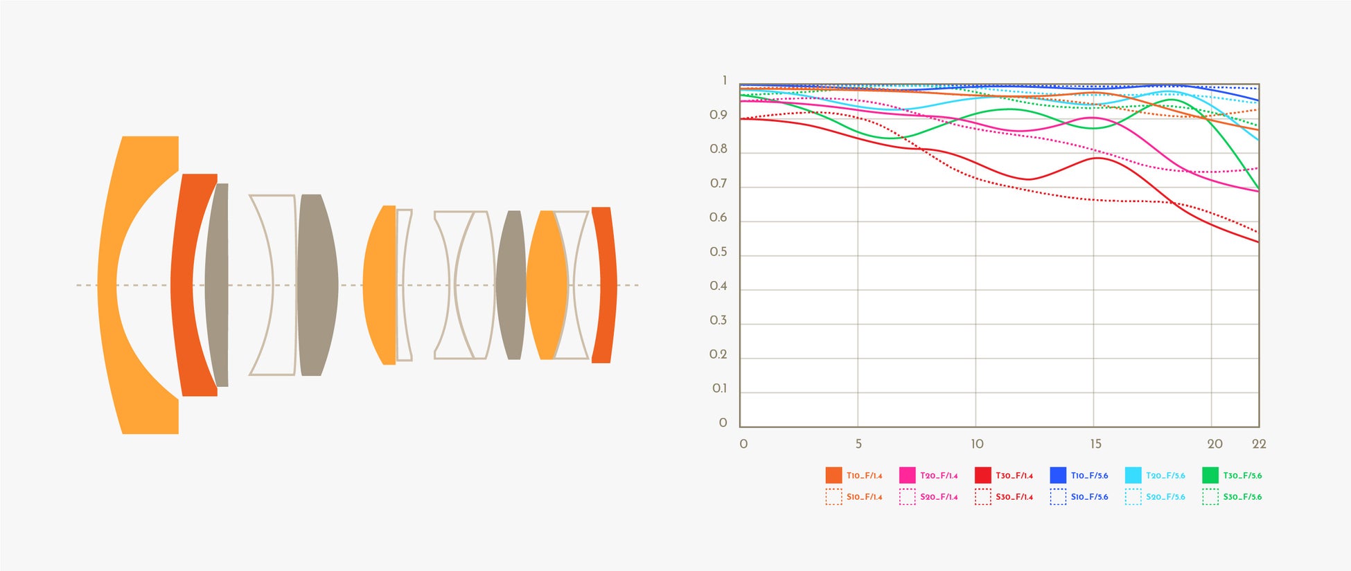 非球面レンズ2枚、EDレンズ3枚、高屈折レンズ3枚を組み合わせた高度な光学設計を採用。色収差やフレアを効果的に抑え、画面中心から周辺まで高いシャープネスとクリアな解像度を実現します。さらに、Thypochの高精度非球面レンズ技術により、ボケ内のオニオンリングを抑制し、なめらかで美しいボケ表現を可能にします。