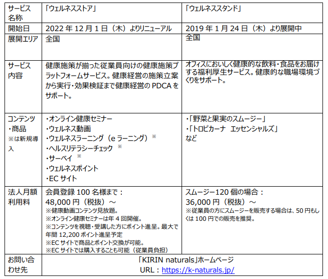 キリンビバレッジ株式会社(社長 吉村透留)は、健康経営を支援する法人向けサービス「KIRIN naturals(キリン ナチュラルズ)」のサービス体系を12月よりリニューアルします。「KIRIN naturals」の導入拠点数は、2022年10月末時点で451拠点に達し、2021年12月末時点と比較して約2割伸長しています。2024年末には、2022年比約3倍の拠点数の導入を目指します。