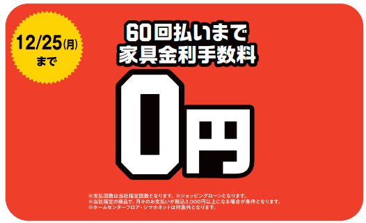 <ⅲ>家具ご購入の際の金利手数料が、60回払いまで無料となります。(12月25日(月)まで)
