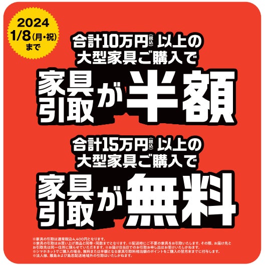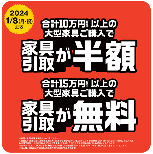 <ⅱ>不要家具の引き取り料金がご購入金額10万円以上で半額、15万円以上で無料になります。(2024年1月8日(月・祝)まで)