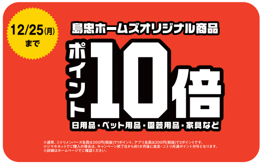 2023年12月6日(水)から12月25日(月)までの期間、島忠・ホームズ全店で島忠・ホームズオリジナル商品をご購入いただくと、ポイントが通常の10倍となるお得なキャンペーンを実施いたします。島忠・ホームズオリジナル商品をお試しいただくチャンスです。