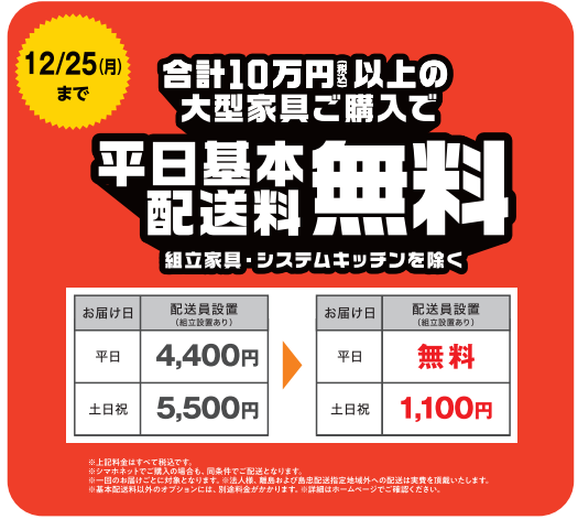 <ⅰ>10万円以上ご購入いただくと平日の配送料(通常4,400円)が無料になります。(12月25日(月)まで)