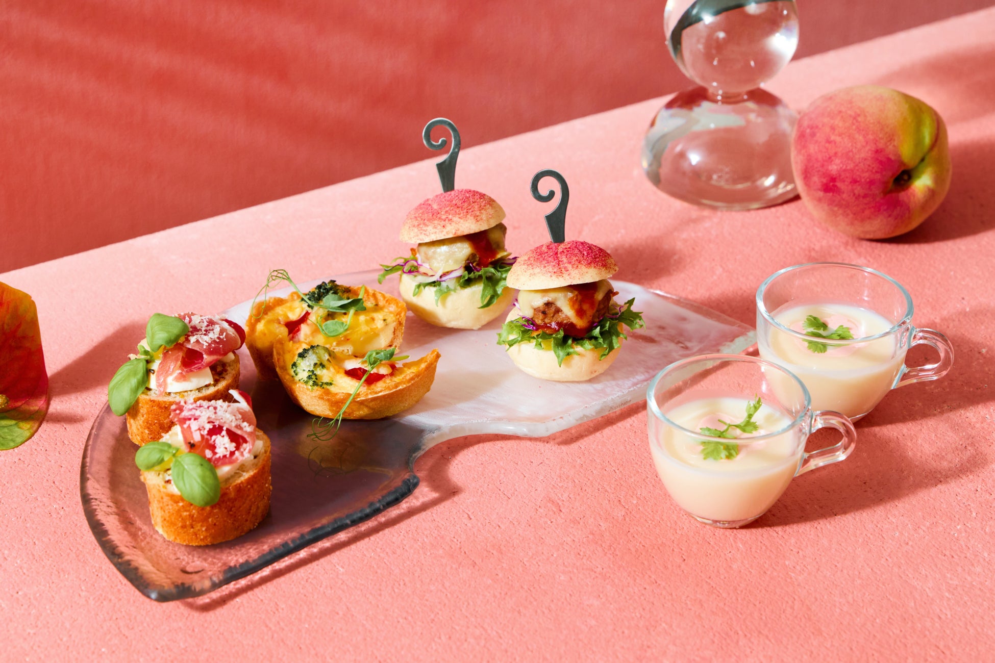 スタンドスイーツには、瑞々しい白桃と黄桃をアールグレイの風味が引き立てる「ピーチタルト」、マスカルポーネと桃が繊細なハーモニーを織りなす「ピーチフロマージュムース」など、旬の桃を堪能するスイーツを6種類ご用意。さらに、桃風味の冷製ビシソワーズや、「桃のカプレーゼブリュスケッタ」をはじめとする4種類のセイボリー、白桃を練り込んだスコーンなど、ウェルカムデセールからセイボリーにいたるまで桃の魅力を余すことなくお楽しみいただける、パティシエこだわりの新作アフタヌーンティーです。ドリンクは、燻製和紅茶や日本伝統茶を含む20種類以上のドリンクを120分間のフリーフローでご利用いただけます。