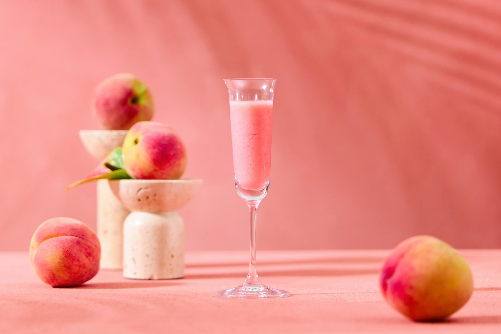 フレッシュの桃を使用したベリーニ。桃の果実をミキサーにかけ、自然な甘さと爽やかな香りが口いっぱいに広がる仕上がりに。