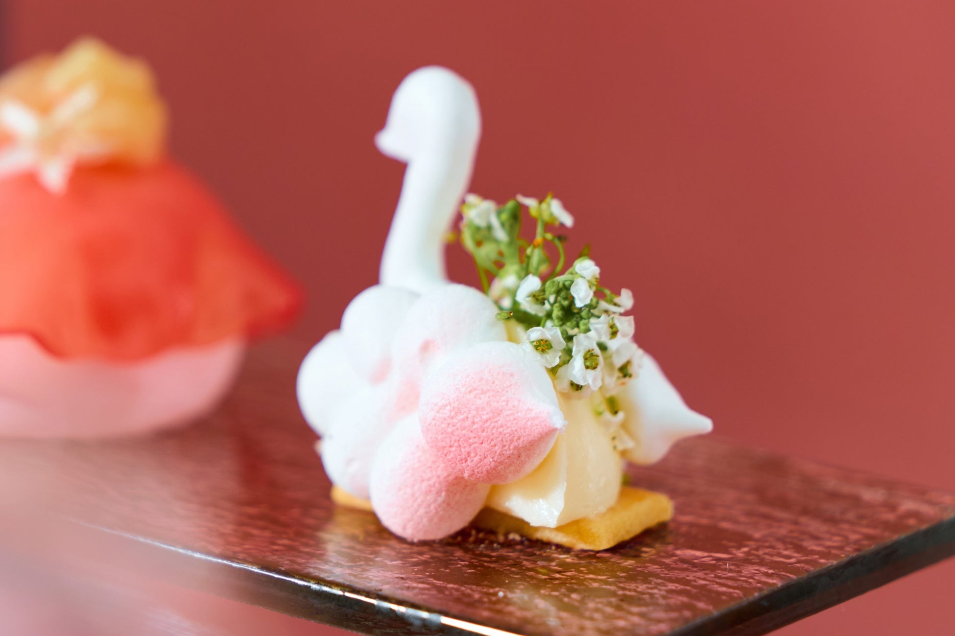 ホワイトチョコレートのムースに繊細なメレンゲを飾り、スワンに見立てたスイーツです。