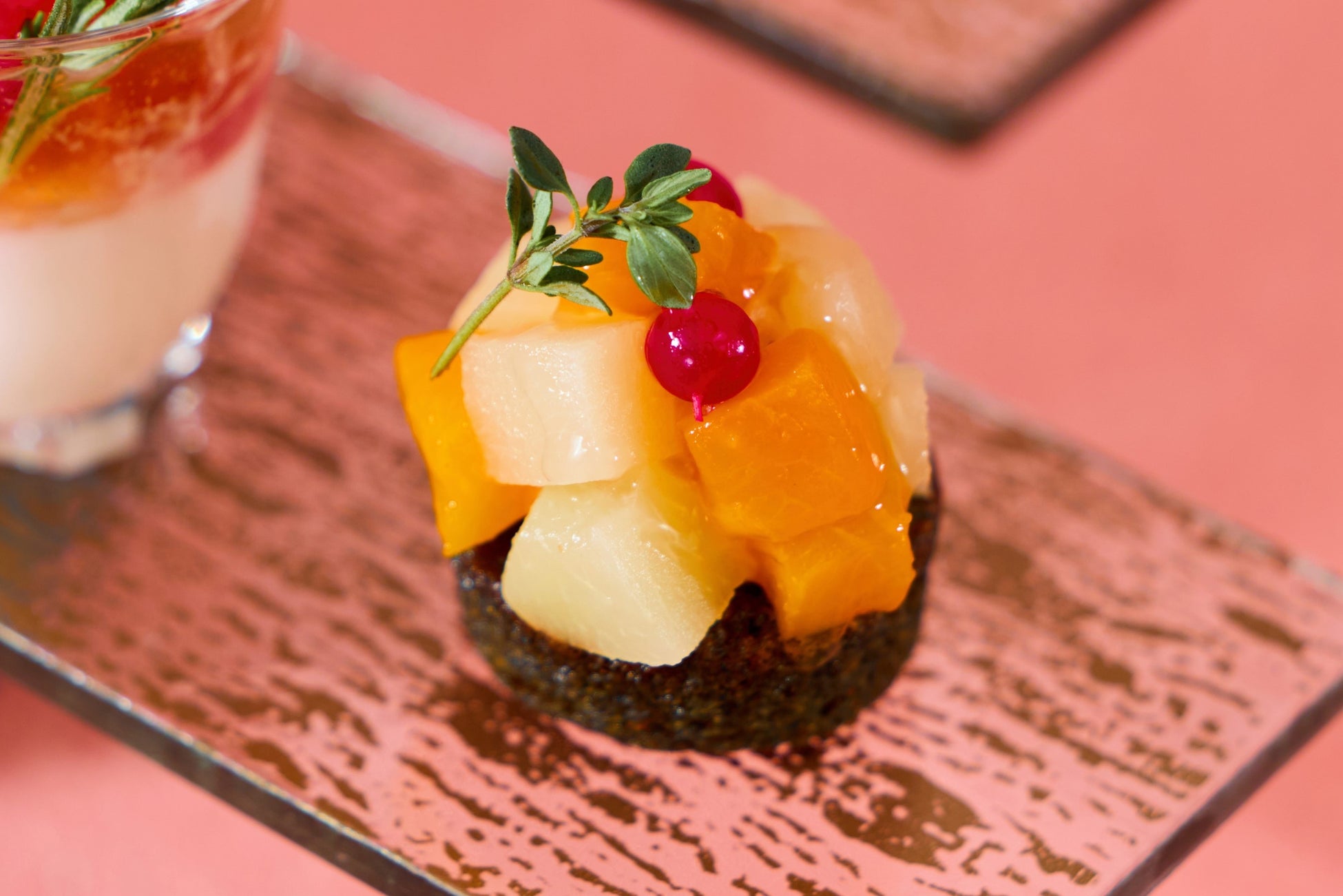 今回のテーマは、旬のフレッシュの桃を半玉分使用するパルフェを主役に据えた、繊細なスイーツが並ぶアフタヌーンティー。まずは、桃本来の風味を楽しめるウェルカムドリンク「フレッシュピーチ・ベリーニ」が皆さまをお迎えします。続いて、本アフタヌーンティー目玉のウェルカムデセール「ピーチパルフェ」がお目見え。桃のジュレと黄桃をしのばせたグラスに半玉分の桃を飾り、蝶をかたどった繊細なチョコレートをあしらって華やかに仕上げました。