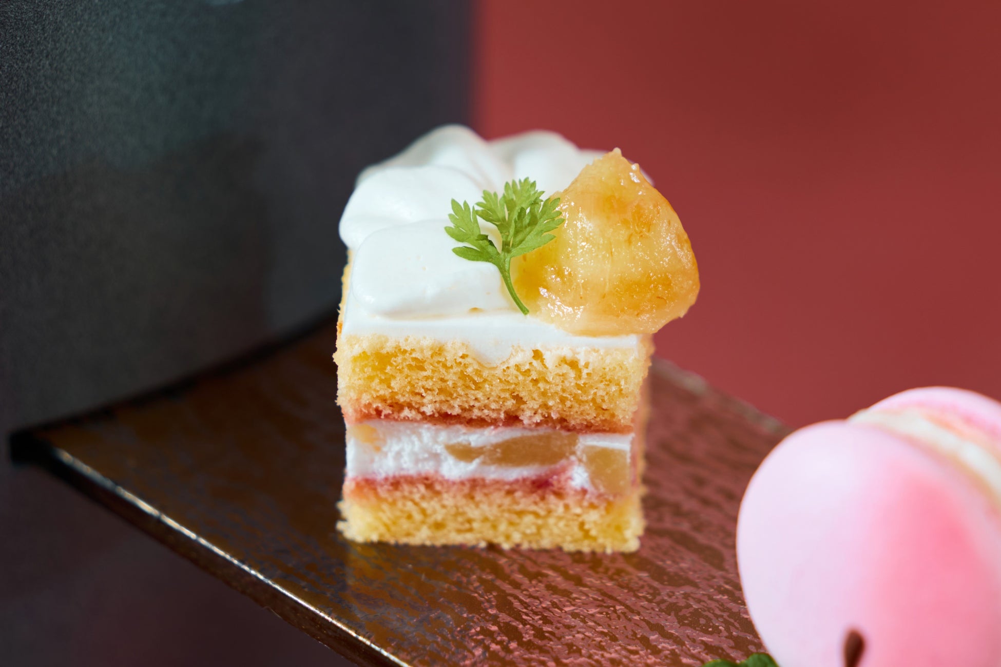 アールグレイが香るしっとりとしたアーモンド生地に、塩キャラメルのガナッシュモンテをふんわりと絞り、2種の桃とグロゼイユ、レモンタイムで華やかに仕上げた大人のスイーツです。