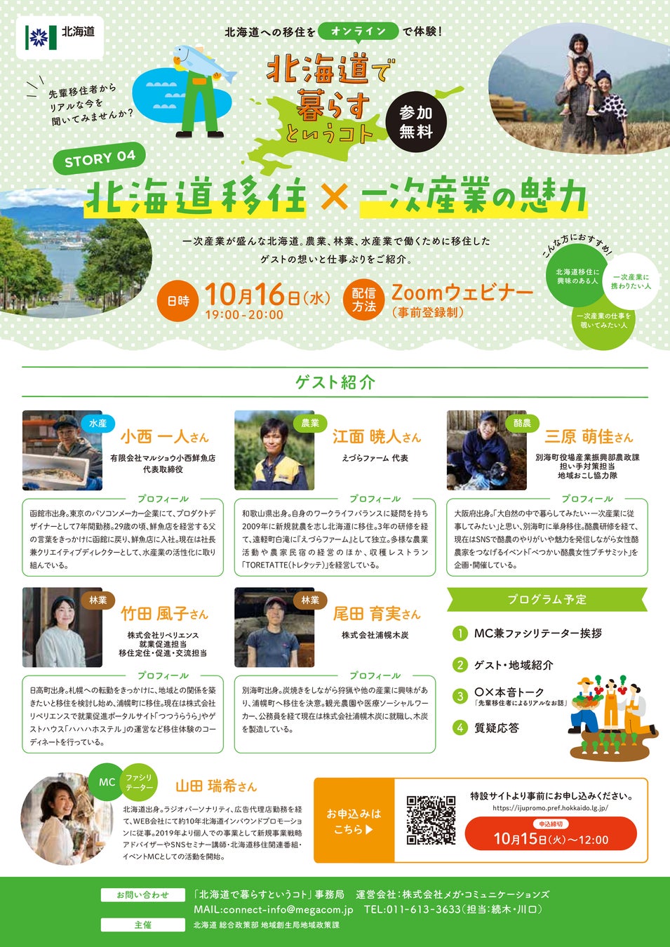 今回は、道内で一次産業(農業、林業、水産業)に携わる5名の移住者をゲストに迎え、北海道で一次産業に就くことの魅力や仕事ぶりについてお話しいただきます。